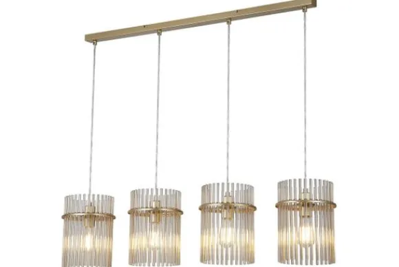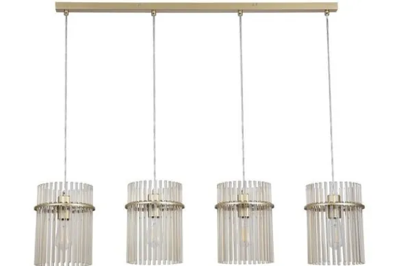 Hanglamp Swizzle 55620-4CP van het merk Searchlight is een verfijnd statementstuk dat luxe en elegantie combineert. De lamp is vervaardigd uit metaal en glas, waarbij de cilindervormige kappen bestaan uit fijne glazen buisjes die het licht zacht verspreiden. Het gouden frame zorgt voor een warme, stijlvolle uitstraling met een vleugje glamour.