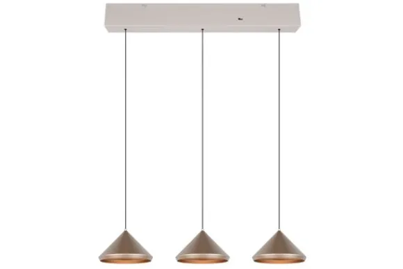 Hanglamp Laguna 336210365 van het merk Trio Lighting is een moderne en stijlvolle lamp met drie kegelvormige kappen van koffie gekleurd metaal. De nette afwerking en de strakke lijnen geven de lamp een verfijnde uitstraling die zowel elegant als tijdloos oogt. Perfect boven een eettafel of kookeiland, waar ze zorgt voor een gelijkmatige en sfeervolle verlichting.