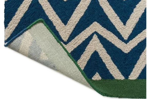 Buitenkleed Dhurrie Blue Outdoor 426318 van het merk Scion Rug Collection is een echte sfeermaker voor binnen én buiten. Het design heeft een speels zigzagpatroon in blauw en beige, afgewerkt met een frisse groene rand, een grafisch accent dat direct karakter geeft aan je ruimte.