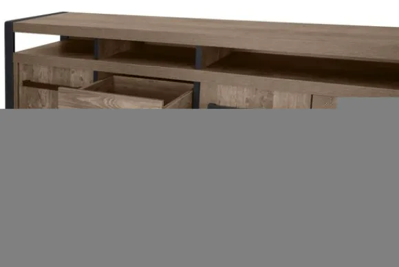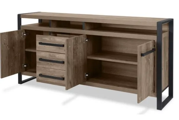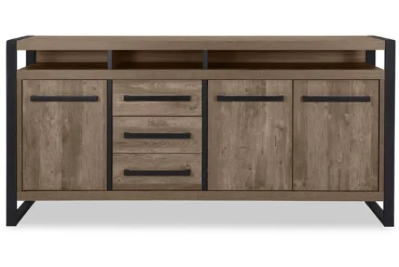 Het dressoir biedt een veelzijdige indeling met bovenin drie open vakken voor decoratie of snelle opbergplek. Daaronder bevinden zich drie gesloten deuren met planken en drie lades. De langwerpige zwarte metalen handgrepen geven het meubel een moderne uitstraling. Alle deuren en lades zijn voorzien van soft-close dempers en soepele ladegeleiders, zodat alles geruisloos sluit.