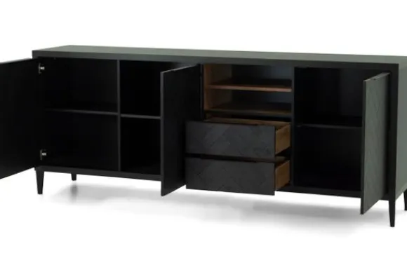 Het dressoir is voorzien van drie deuren, twee lades en twee open vakken. De lades en deuren zijn uitgerust met softclose dempers en ladegeleiders. Het meubel staat op hoge houten pootjes en is gemaakt van sterk Lamulux materiaal. Deze hoogwaardige kunststof heeft de uitstraling van hout, maar is krasvast, slijtvast en stootvast en eenvoudig te onderhouden zonder houtwerking.