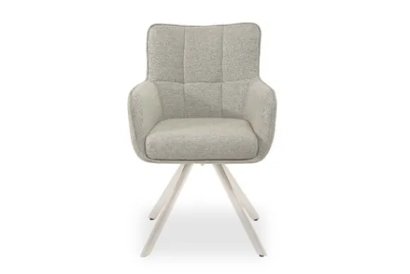 Eetkamerstoel Tori van het merk Livingfurn is bekleed met stof in de kleur Sand Natural en staat op een wit metalen onderstel. De ruime zitting met armleuningen en het comfortabele zitkussen zorgen voor een prettige en ontspannen zit aan tafel.