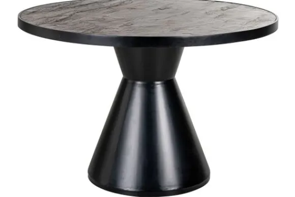 Eettafel Russel 211605 van het merk Richmond Interiors is vervaardigd uit steen fineer en een metalen poot. Steen fineer is een echte natuursteen in de vorm van fineer, niet dikker dan 2-3 mm. Het materiaal is zeer flexibel en licht van gewicht. De metalen poot is in de vorm van een koker en loopt taps naar buiten.