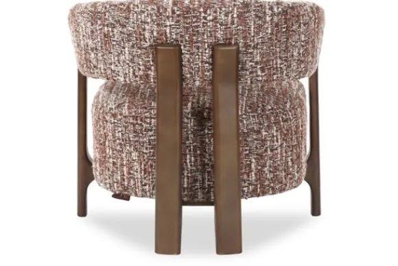 De fauteuil is bekleed met een grove, gemêleerde stof waarin verschillende bruine en crème tinten samenkomen. Dit geeft een levendig effect dat prachtig combineert met de warme houten poten.
