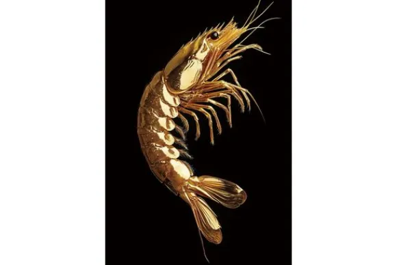 Glasschilderij Gouden Garnaal 080120-1115 van het merk Ter Halle toont een goudkleurige garnaal, centraal tegen een diepe zwarte achtergrond. Het glanzende oppervlak vangt het licht waardoor het geheel een krachtig en stijlvol statement vormt.
