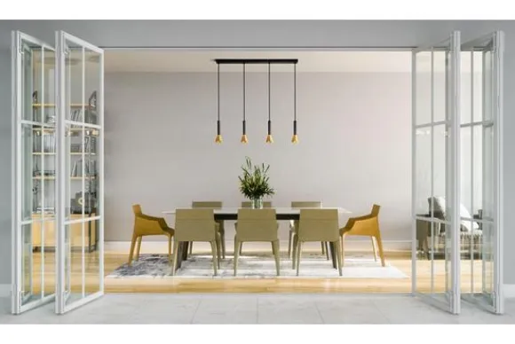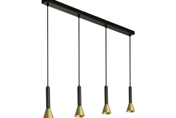 Hanglamp Signal 13611-4BGO van het merk Searchlight is een simplistische, maar hippe hanglamp met een smalle gouden lampenkap en zwarte bedrading. Deze lamp heeft vier lichtfittingen die naast elkaar aan de zwarte plafondbalk hangen. Er zijn meerdere varianten van deze lamp verkrijgbaar.