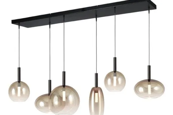 Hanglamp Lido 2861-05-021302561234 van het merk Masterlight is een speelse lamp met een elegante uitstraling. Wat deze lamp zo bijzonder maakt, is dat de lampenkappen zijn gemaakt van fading glas. Bij fading glas is er een prachtige overloop van donker naar licht. De basis is van metaal en uitgevoerd in de kleur zwart. De hanglamp heeft zes glazenlampen waarvan twee ovaal met een diameter van 24 centimeter, één ovaal met een diameter van 11.5 centimeter, één rond met een diamter van 24 centimeter en twee rond met een diamter van 17 centimeter. Hang de lamp boven je eettafel of in de gang. De lamp komt goed tot zijn recht in verschillende soorten ruimtes. Bepaal zelf de sfeer door het triac-dim systeem wat bij de hanglamp zit. Zacht licht voor de knusse momenten en wat harder licht als je gezellig met z’n allen een spel wilt spelen. Triac-dim wil zeggen dat de lampen met een triac dimbare muurdimmer te dimmen zijn. Op het armatuur zelf zit geen dimmer. De hanglamp is inclusief de lichtbronnen.