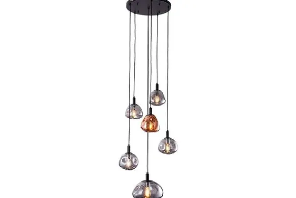 Hanglamp Air Melt 6-lichts van het merk Toms Luxury Lights is een 6-lichts hanglamp. Door het zwarte staal in combinatie met het met het glas krijgt deze lamp een stoere en industriële uitstraling. De lichtbronnen zijn verstelbaar naar wens. Hierdoor kun je een speels effect creëeren. Het glas zorgt voor een bijzondere lichtinval dat de ruimte laat stralen. De lamp is voorzien van 6 x een E27 (grote) fitting en heeft een maximale wattage van 25 Watt. De hanglamp is dimbaar middels een externe dimmer en een dimbare lichtbron. De lamp wordt geleverd inclusief lichtbron.
