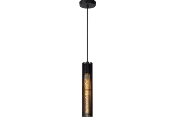 Hanglamp Lionel van het merk Lucide is een slanke hanglamp in zwart metaal. De cilindervormige kap met smalle lamellen zorgt voor een moderne, industriële look.