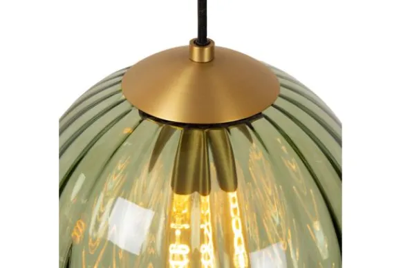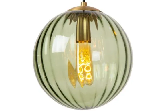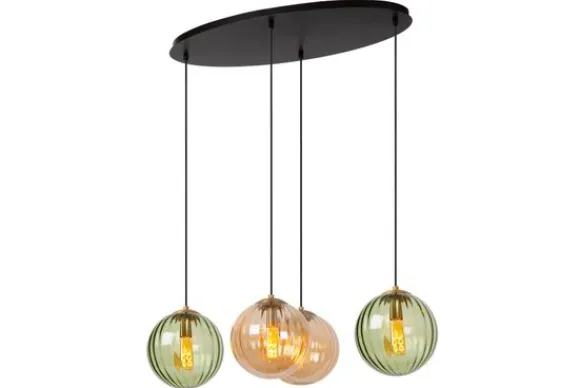 Hanglamp Monsaraz 45493/04/33 van het merk Lucide is een stijlvolle vierlichts lamp met glazen bollen in warme tinten groen en amber. De subtiele ribbelstructuur in het glas creëert een speels lichteffect dat zorgt voor een warme en elegante uitstraling boven een eettafel of kookeiland.