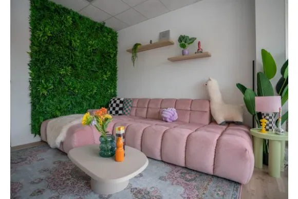 Deze bank oogt robuust door de vaste zit- en rugkussens en de zitting die doorloopt tot net boven de grond. De bank heeft een unieke uitstraling dankzij het het blokpatroon. Daarnaast is deze bank bedoeld om helemaal op weg te kunnen kruipen door de diepe zitting.