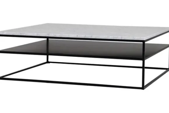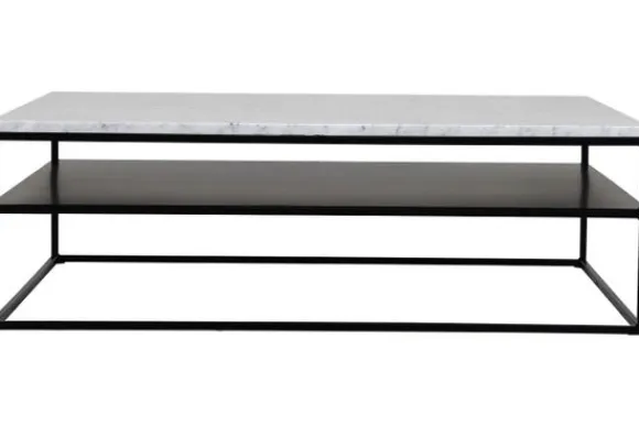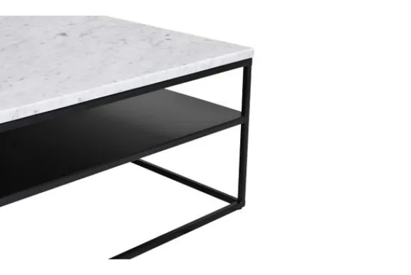 Deze salontafel wordt standaard uitgevoerd met een wit marmere blad en met zwarte metalen poten.