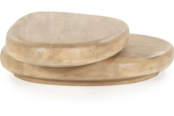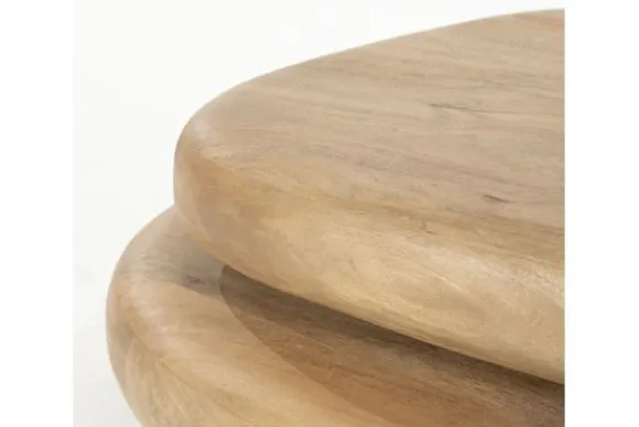 Gemaakt van massief mangohout in een lichte, warme bruintint, bestaat deze tafel uit twee organisch gevormde, overlappende bladen die lijken te zweven boven elkaar. De afgeronde randen en asymmetrische vormen geven het geheel een zachte, vloeiende uitstraling, alsof de tafel is gevormd door de natuur zelf.