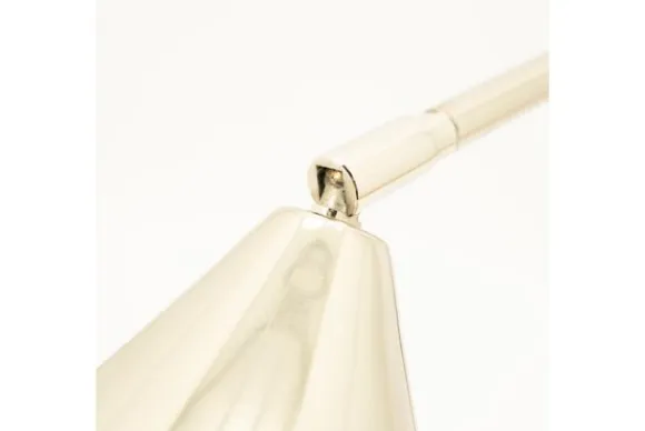 De combinatie van koele metalen en marmer creëert een harmonieus geheel. Het licht weerkaatst subtiel in de zilveren binnenzijde van de kap en verspreidt een aangename gloed.