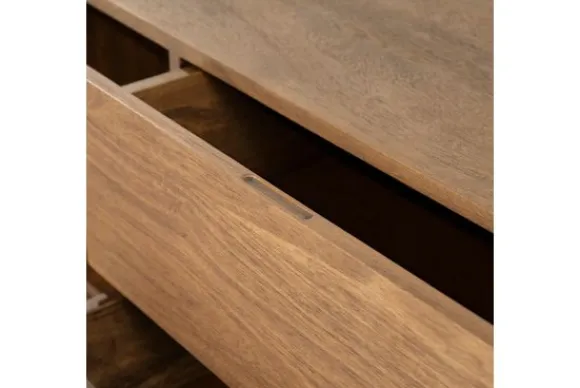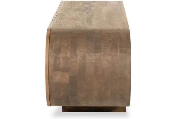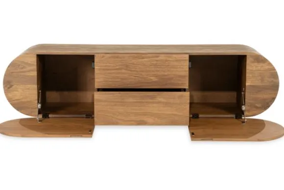 Het tv-meubel is gemaakt van mangohout en mango fineer. Het hout is geborsteld afgewerkt waardoor de nerf goed zichtbaar blijft. De afgeronde zijkanten en rechte lijnen zorgen voor een vloeiende vorm die eenvoudig te combineren is met andere meubels.