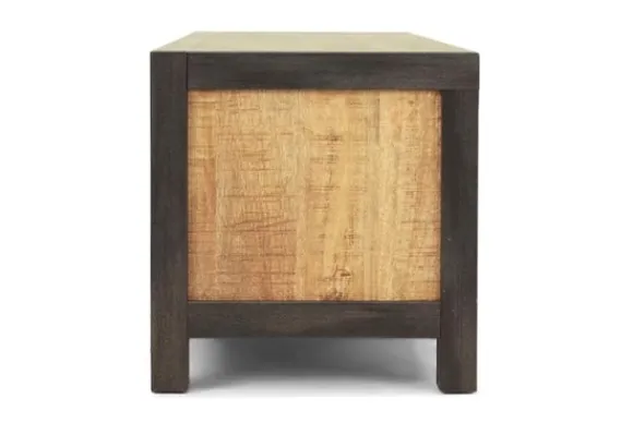 Tv-meubel Jatoba – City van het merk Lamulux is uitgevoerd in de kleur Mango. De sterke lamulux bovenlaag geeft het meubel een stoer decor dat goed past in moderne en industriële interieurs. Het tv-meubel heeft twee deuren met verticale planken en in het midden twee open vakken.