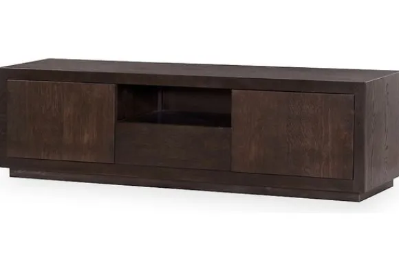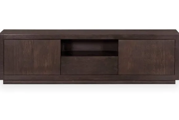 Tv-meubel Mincio van het merk Tower Living is een robuust meubel gemaakt van massief eikenhout in een diepe espressokleur. Het ontwerp straalt kracht uit en heeft een warme, natuurlijke uitstraling.