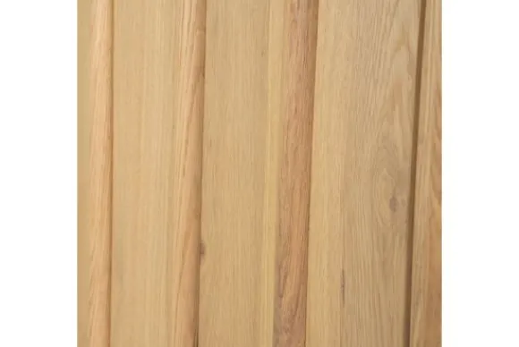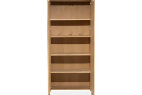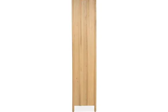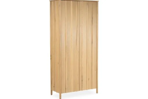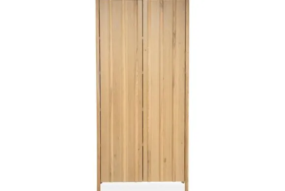 Het kabinet is gemaakt van eikenhout en eiken fineer. De deuren zijn afgewerkt met verticale latten die zorgen voor een gelijkmatig lijnenspel. De afgeronde hoeken en het slanke silhouet geven het meubel een verzorgde en rustige uitstraling.