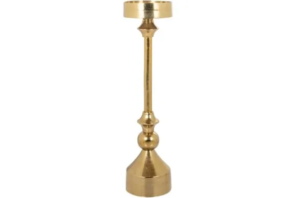 Kandelaar Presley klein 212416 van het merk Richmond Interiors is gemaakt van goudkleurig aluminium, wat hem een luxe uitstraling geeft. De kandelaar is geschikt voor grote waxinelichten en stompkaarsen.
