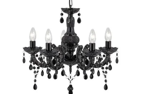 Hanglamp Marie Therese 1455-5BK van het merk Searchlight is een kleine zwarte kroonluchter en beschikt over vijf fittingen. Dit klassieke model schittert geweldig dankzij de vele kristallen.