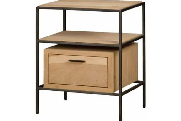 De kast is gemaakt van eiken fineer in combinatie met een metalen frame en beschikt over één lade en één open vak.
