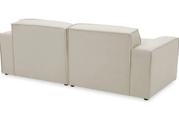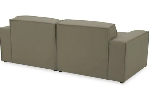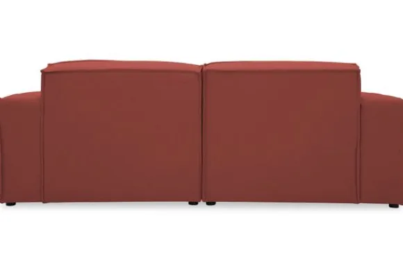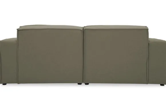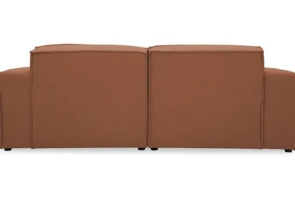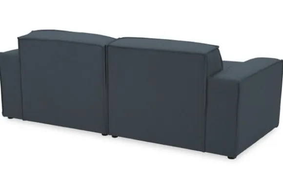 Zitbank Loki van het merk Dakota Industrial oogt robuust door de vaste kussens en de zitting die doorloopt tot net boven de grond. De bank heeft diepe zittingen en is afgewerkt met geknepen naden.
