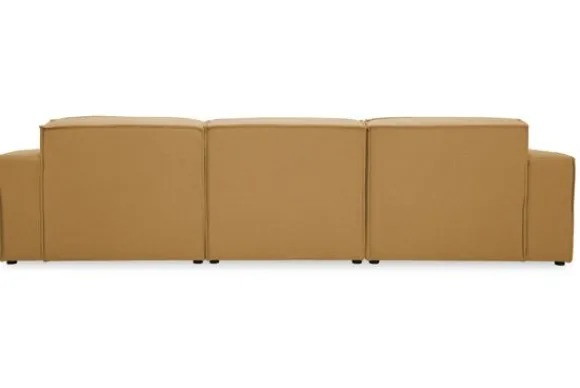 Zitbank Loki van het merk Dakota Industrial oogt robuust door de vaste kussens en de zitting die doorloopt tot net boven de grond. De bank heeft diepe zittingen en is afgewerkt met geknepen naden.