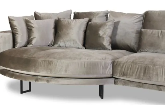 Loungebank Dordoni II van het merk Be Inspired is verkrijgbaar in alle kleuren en in verschillende materiaalsoorten zoals ribstof, teddy en velvet. Je kunt kiezen uit diverse afmetingen. De Dordoni II bank wordt standaard uitgevoerd met alle sierkussens en lendekussens die ook op de foto te zien zijn. De rugkussens daar achter zijn lekker hoog, deze combinatie zorgt voor een goede ondersteuning van de rug. Alle rugkussens zitten los en zijn omkeerbaar, de zitkussens zitten vast met klittenband. Het unieke aan de Dordoni II is het ronde loungegedeelte. Je kunt hier lekker wegkruipen tussen alle sierkussens. Deze bank oogt ruimtelijk door de hoge metalen sledepoten.