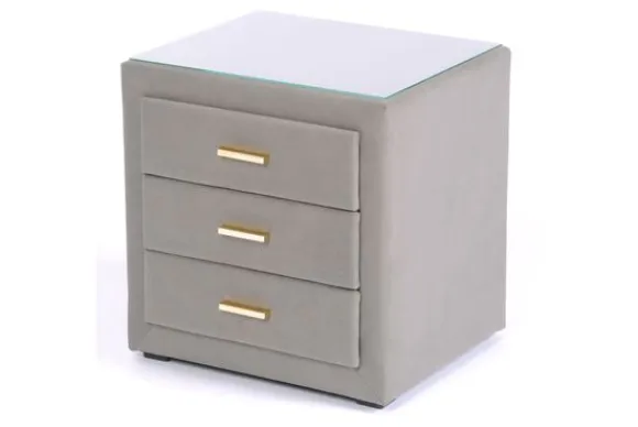 Nachtkastje Ottawa van het merk Bed & Beyond is verkrijgbaar in alle kleuren en verschillende materiaalsoorten als stof en velvet. Bovenop het nachtkastje ligt een glasplaat die de stof beschermt tegen vuil en bijvoorbeeld gemorst water. Het nachtkastje heeft drie lades met metalen handgrepen waardoor je ruimte genoeg hebt om verschillende spullen handig naast je bed te bewaren binnen handbereik. De handgrepen kunnen in chroom of messing gekozen worden.