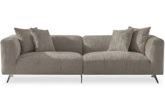 De bank heeft een strakke, knusse uitstraling en de armleuningen lopen op dezelfde hoogte als de rugleuning. De bank wordt standaard uitgevoerd met zwarte poten. Ook worden de sierkussens standaard bijgeleverd.