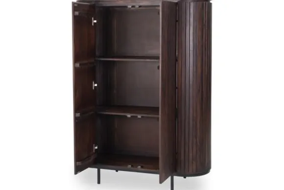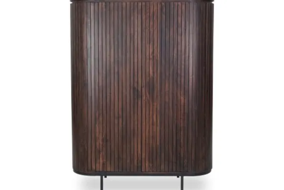 Bergkast Noor van het merk Livingfurn is een moderne bergkast met een rustige uitstraling. De kast is gemaakt van mangohout en opgebouwd uit verticale houten plankjes. Dit zorgt voor een strak lijnenspel en een natuurlijke uitstraling. Mangohout laat duidelijke kleurverschillen en structuren zien waardoor elke kast een eigen uiterlijk heeft. Het onderstel is gemaakt van gecoat staal en zorgt voor een stabiele en stevige basis.