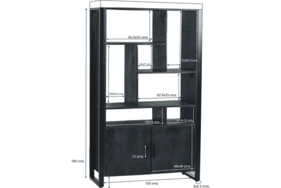 De kast beschikt over zeven open vakken in verschillende afmetingen voor boeken en decoratie. Onderin bevinden zich twee deuren voor het opbergen van spullen uit het zicht.