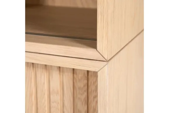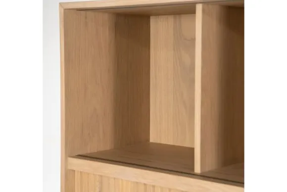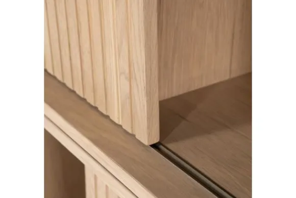 De boekenkast is gemaakt van eikenhout en eiken fineer. De houtstructuur blijft zichtbaar en geeft de kast een natuurlijke uitstraling. De schuifdeuren zijn uitgevoerd met verticale ribbels en maken het mogelijk om delen van de vakken af te sluiten.