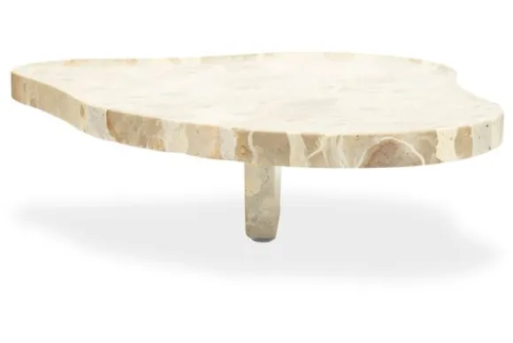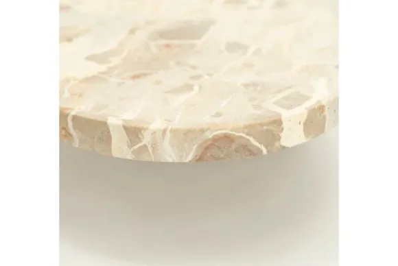 Het dienblad is gemaakt van marmer in zachte beige tinten met subtiele aders die elk exemplaar uniek maken. De gladde afwerking zorgt voor een luxe uitstraling, terwijl de speelse vorm een eigentijds karakter toevoegt.