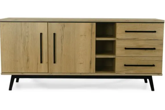 Het dressoir biedt diverse opbergmogelijkheden met twee deuren, drie lades en drie open vakken. De lamulux toplaag is kras-, slijt- en stootvast, voelt aan als massief hout maar kent geen houtwerking. Lamulux is eenvoudig te onderhouden, voorzien van kindvriendelijke afwerking en de lades en deuren zijn uitgerust met een softclose systeem.