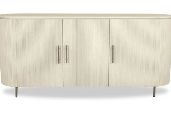 Het dressoir heeft drie deuren en en twee planken. De pootjes en handgrepen zijn grijskleurig.