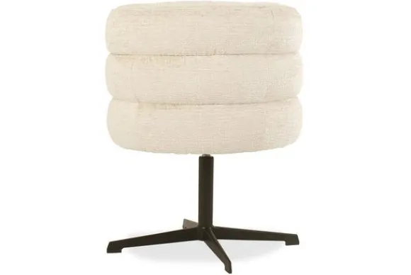 De slanke zwarte metalen sterpoot voegt een industrieel accent toe en zorgt voor een luchtige, stabiele basis die perfect contrasteert met de zachte rondingen van de zitting. Dankzij het 360 graden draaimechanisme combineert deze stoel elegantie met praktisch gebruiksgemak, ideaal voor een dynamische eethoek of stijlvolle werkplek.