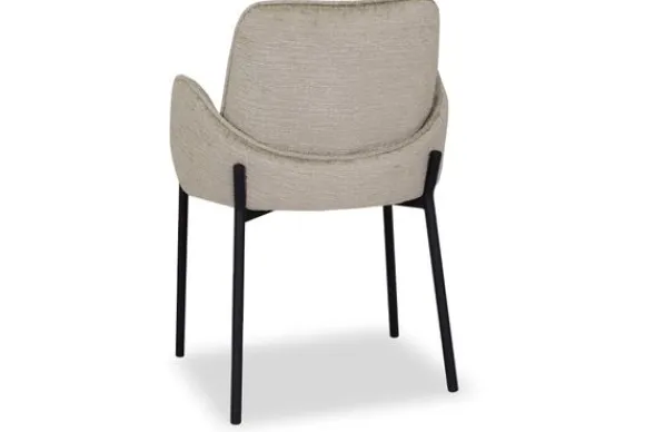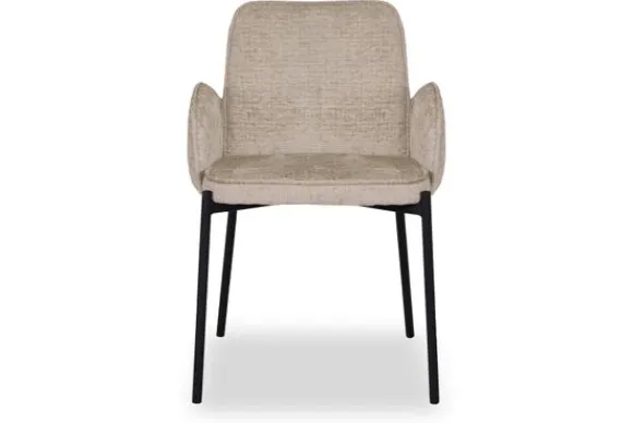 Eetkamerstoel Joni, uitgevoerd in beige elegance heeft een luxe ronde zitting, rugleuning en is in het bezit van armleuningen. Deze combinatie maakt Joni een luxe eetkamerstoel met ontzettend veel comfort. De armleuningen lopen achter de rugleuning langs waardoor de eetkamerstoel een uniek uiterlijk krijgt en er ook nog eens ontzettend leuk uitziet aan de achterkant. Dat is natuurlijk een fijne bijkomstigheid als de eetkamerstoelen aangeschoven staan aan tafel. Het ranke maar doorlopende zwarte frame waar de zitting als ware op rust geeft de eetkamerstoel een luchtige uitstraling. Het uiteinde van het frame loopt op vier zijdes een klein stukje door wat zorgt voor een speels effect.