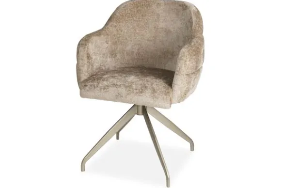 Eetkamerstoel Sigi van het merk Devira is verkrijgbaar in alle kleuren en verschillende materiaalsoorten zoals stof, velvet en rundleder. De horizontale stiksels op de achterkant van de stoel geven de stoel een chique uitstraling en hierdoor maakt de eetkamerstoel jouw zithoek compleet binnen meerdere stijlen. Je kunt ook heerlijk stevig zitten in de stoel dankzij de ronde armleuningen. De stoel heeft een gladde binnenkant, vertikale stiksels aan de buitenkant van de rugleuning en ronde armleuningen. Deze eetkamerstoel (zoals afgebeeld) wordt standaard geleverd met de 503 champagne metalen 360 graden draaispinpoot met terugdraaisysteem. Bij het terugdraaisysteem kun je de zitting van de stoel draaien en daarna zal deze uit zichzelf weer terugdraaien naar het midden.
