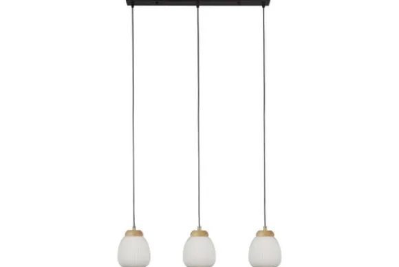 Hanglamp 31411-3NA Ella van het merk Searchlight is een mooie lamp met geribbeld wit glas en houten uiteinden. Deze lamp heeft drie lichtbronnen die naast elkaar aan een zwarte plafondbalk hangen. Er zijn meerdere versies van deze lamp verkrijgbaar in deze lampenserie.