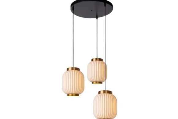 Hanglamp Gosse van het merk Lucide geeft een throwback naar de jaren 20 met deze stijlvolle porseleinen hanglamp. De drie lichtbronnen zijn elk omhuld door een cilindervormige koker, met een messing top en voet. De Gosse lamp is 156 centimeter lang en 55 centimeter breed. Hang deze eyecatcher in een ruime inkomhal voor een maximaal effect of maak hem het middelpunt van belangstelling boven de salontafel. In welke ruimte Gosse ook tot zijn recht komt, zijn warme gloed maakt het tot een aangenaam vertoeven. Bovendien kan je Gosse makkelijk aansluiten op een dimmer voor nog meer sfeer.