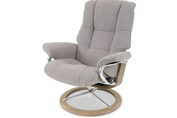 Relaxfauteuil Mayfair Signature van het merk Stressless is verkrijgbaar in alle kleuren. Tevens is de fauteuil leverbaar in stof en rundleder. Je kunt bij deze fauteuil kiezen uit diverse maten zoals Small, Medium en Large. Deze fauteuil heeft een Plus en Glide Systeem: Aan beide zijden van de fauteuil zit een knop waarmee je de weerstand van de stoel kan aanpassen naar eigen behoefte. Door de knoppen in tegengestelde richting te draaien stel je jouw ideale relaxpositie samen. Op die manier krijgt de nek en de onderrug goede onderstuening. Door de rugleuning naar voren te buigen activeer je de slaapfunctie. Op het moment dan je weer rechtop komt stelt de stoel zichzelf weer bij naar de normale stand.