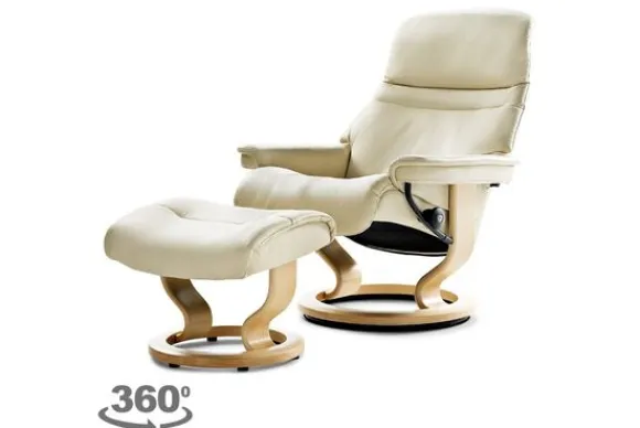 Relaxfauteuil Sunrise Classic van het merk Stressless is verkrijgbaar in meer dan 150 kleuren. Tevens is de fauteuil leverbaar in stof en rundleder. Je kunt bij deze fauteuil kiezen uit diverse maten zoals Small, Medium en Large. Deze fauteuil heeft een Plus en Glide Systeem: Aan beide zijden van de fauteuil zit een knop waarmee je de weerstand van de stoel kan aanpassen naar eigen behoefte. Door de knoppen in tegengestelde richting te draaien stel je jouw ideale relaxpositie samen. Op die manier krijgt de nek en de onderrug goede onderstuening. Door de rugleuning naar voren te buigen activeer je de slaapfunctie. Op het moment dan je weer rechtop komt stelt de stoel zichzelf weer bij naar de normale stand.
