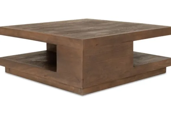 De tegengestelde plaatsing van de vakken aan beide zijden geeft een speels uiterlijk. Dankzij de robuuste vormen en industriële afwerking past deze salontafel perfect in een industrieel interieur met moderne accenten.