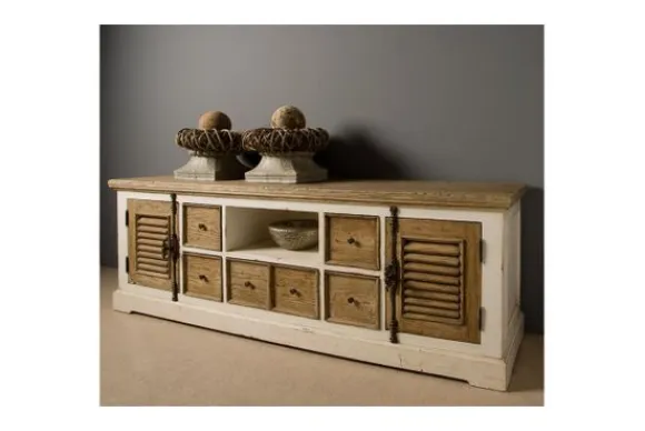 Tv-meubel Amanda TD 0016 van het merk Tower Living is gemaakt van hergebruikt grenen. Het geleefde hout geeft deze kast een romantische en landelijke uitstraling. Je kunt dit hout makkelijk schoonmaken met een zachte vochtige doek. Deze kast heeft diverse opbergmogelijkheden, namelijk één open vak, zes lades en twee deuren.