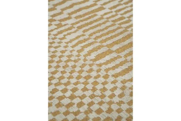 Vloerkleed Berber Erg 9648 van het merk Louis de Poortere is een hedendaagse interpretatie van traditioneel Marokkaans vakmanschap. Het grafische patroon, met een levendige afwisseling van lijnen en blokken in geel en beige, creëert een dynamisch geheel dat zowel modern als tijdloos oogt.