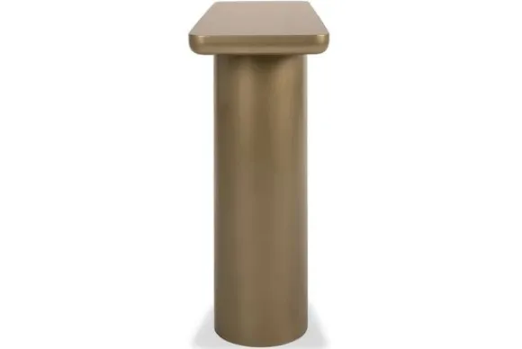 De afgeronde vormen van het blad vloeien harmonieus samen met de sculpturale, halfronde poten. De warme goudtint en het strakke lijnenspel zorgen voor een moderne elegantie die perfect past in een hotel chic interieur.