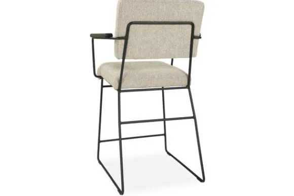 Het smalle frame en de open ruimte tussen zitting en rugleuning geven de barkruk een luchtige uitstraling. De poten zijn uitgevoerd in zwart gepoedercoat metaal voor een strakke afwerking.
