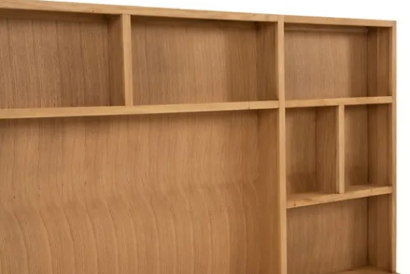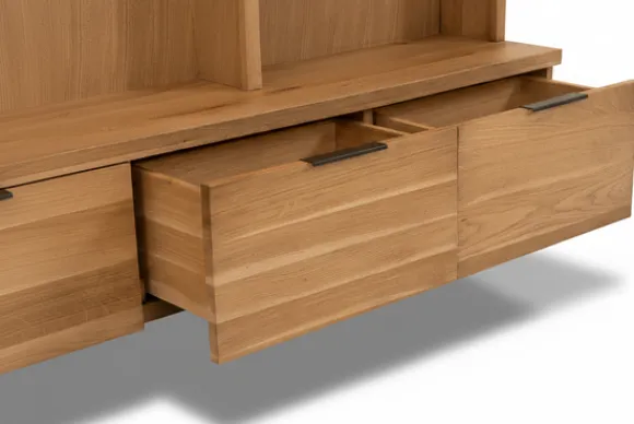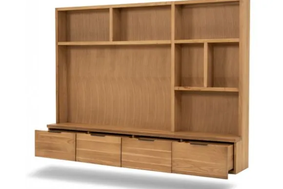 De hangkast beschikt over zes open vakken voor het presenteren van woonaccessoires en decoratie. Daarnaast zijn er vier lades aanwezig die zijn uitgevoerd met een softclose systeem. Deze indeling zorgt voor een prettig evenwicht tussen open en gesloten opbergruimte.