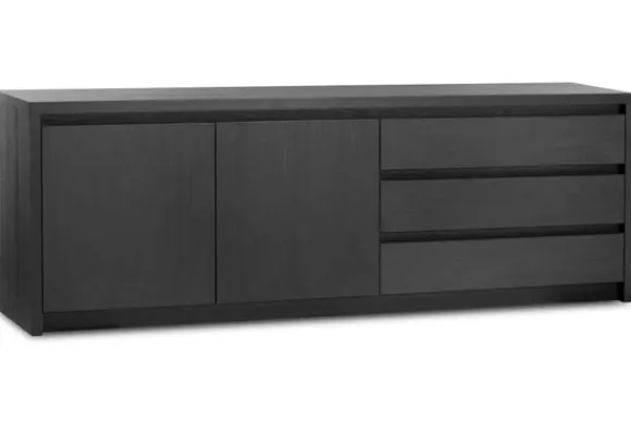 De kast is volledig gemaakt van hout en heeft een moderne uitstraling. De diepe zwarte kleur geeft het dressoir een luxe en eigentijdse look die goed aansluit bij verschillende woonstijlen.